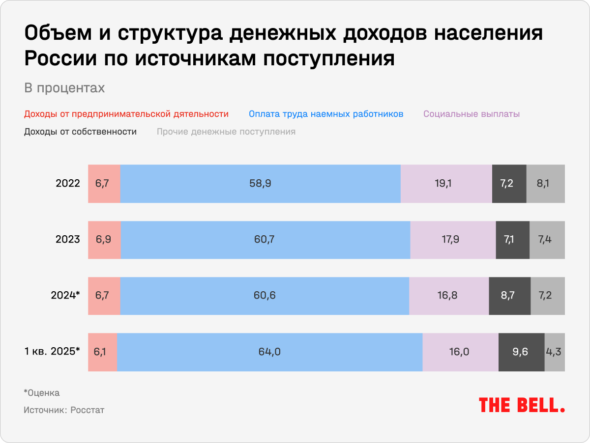 Наименьший рост — 6,5% — наблюдается у группы с самыми низкими доходами (1-я группа). Максимальный — 10% — у наиболее обеспеченной группы (10-я). Связано это и с выплатами, которые перевели вчерашних бедных в категорию среднего класса, и с ростом зарплат у квалифицированных рабочих и инженеров, и с инфляцией: у богатых есть дополнительный доход от высоких процентов по сбережениям. Но в основе этих процессов — война, которая стала важным перераспределителем денег в экономике, но не уравнителем. Богатые по-прежнему богатеют, а бедные беднеют.