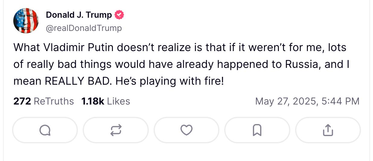 Дональд Трамп опубликовал еще один пост о Владимире Путине. В этот раз он предупредил российского лидера о том, что тот играет с огнем, однако сделал это в более споконой манере, чем днем ранее.