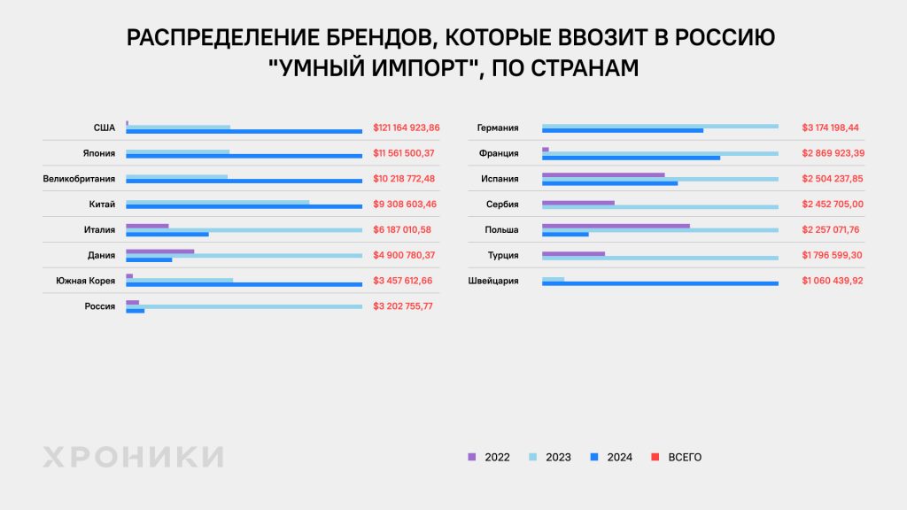 Хотя поставки через Литву и попали в поле нашего внимания, на деле они составляют лишь небольшую долю от общего объёма импорта, организованного через «Умный импорт». Основной массив ввезённых товаров охватывает сотни брендов и наименований, среди которых особенно выделяются те, что были поставлены на сумму свыше одного миллиона долларов.