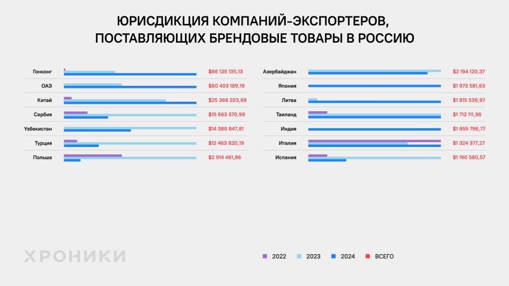 «Хроники» проанализировали компании, которые поставляли продукцию «Умному импорту», и изучили юрисдикции, откуда ввозились товары. Результаты этого анализа показывают масштабность и географическую разветвлённость логистических цепочек. В числе главных отправных точек — Гонконг (66 миллионов долларов), Объединённые Арабские Эмираты (60 миллионов долларов), Китай (25 миллионов долларов), Сербия (15 миллионов долларов), Узбекистан (14 миллионов долларов), Турция (12 миллионов долларов), а также десятки других стран, включая Польшу и Литву.