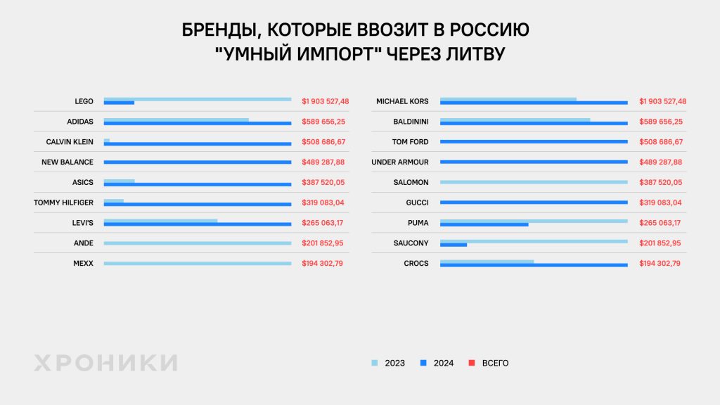 Среди брендов, поставляемых через Литву, лидирует ушедшая с российского рынка в 2022 году датская компания Lego — поставки шли через компании, зарегистрированные в Турции и ОАЭ, а суммарная стоимость ввоза составила почти 1,9 миллиона долларов. Существенные объёмы пришлись и на Adidas (589 тысяч долларов), Calvin Klein (509 тысяч долларов) и New Balance (489 тысяч долларов). В списке — десятки узнаваемых брендов, от спортивной одежды до люксовых аксессуаров. Через Литву также шли поставки продукции Asics, Tommy Hilfiger, Levi’s, Michael Kors, Baldinini, Under Armour, Crocs и других. Весь этот импорт проходил через страну — члена ЕС, которая официально заявляет о поддержке санкционного режима против России.