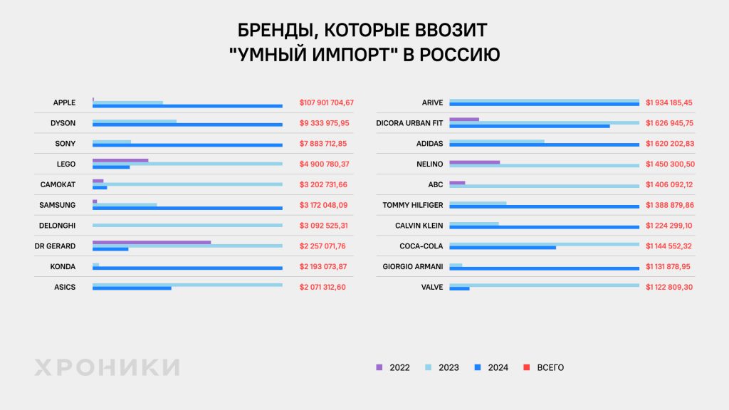 Согласно данным таможенной статистики, крупнейшим поставщиком стала американская корпорация Apple — на российский рынок было ввезено техники этого бренда на сумму более 107 миллионов долларов. Это самый высокий показатель среди всех проанализированных брендов. На втором месте — британская компания Dyson, известная своими пылесосами и техникой для ухода за волосами, с поставками на 9,3 миллиона долларов. Далее следуют японская Sony (7,88 миллиона долларов), датская Lego (4,9 миллиона долларов), южнокорейская Samsung (3,2 миллиона долларов) и итальянский производитель бытовой техники DeLonghi (3,1 миллиона долларов).