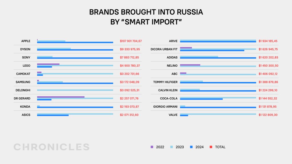 After the invasion of Ukraine, hundreds of Western brands officially left Russia. But thanks to Smart Import, a sanctioned subsidiary of Sberbank, products from Apple, Adidas, Lego, Dyson and dozens of other companies continue to flow into the country. A parallel logistics system was built through Hong Kong, the United Arab Emirates, Serbia and Uzbekistan, providing Russian shelves with products that manufacturers formally refused to supply.
