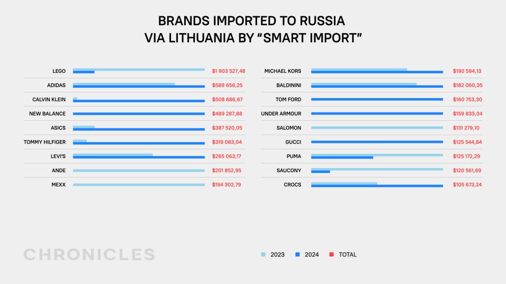 Among the brands delivered through Lithuania, the Danish company Lego, which left the Russian market in 2022, is in the lead — deliveries were made through companies registered in Turkey and the United Arab Emirates, and the total import cost was almost $ 1.9 million. Significant volumes also fell on Adidas ($589,000), Calvin Klein ($509,000) and New Balance ($489,000). The list includes dozens of recognizable brands, from sportswear to luxury accessories. Lithuania also supplied products from Asics, Tommy Hilfiger, Levi’s, Michael Kors, Baldinini, Under Armour, Crocs and others. All these imports passed through an EU member state, which officially declares its support for the sanctions regime against Russia.