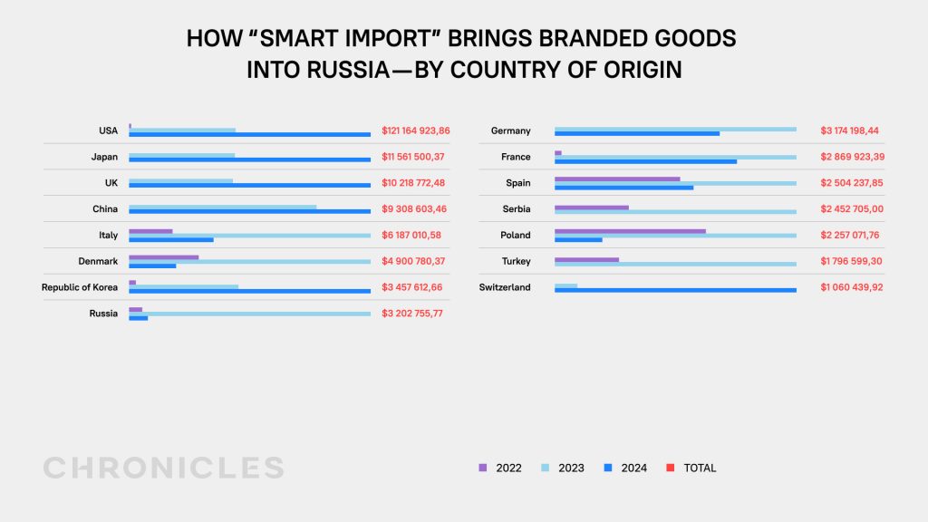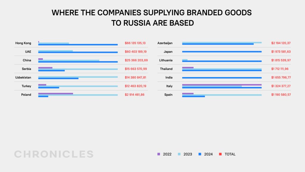 Chronicles analyzed the companies that supplied products to Smart Import, and studied the jurisdictions from which the goods were imported. The results of this analysis show the scale and geographical branching of logistics chains. Among the main starting points are Hong Kong ($66 million), the United Arab Emirates ($60 million), China ($25 million), Serbia ($15 million), Uzbekistan ($14 million), Turkey ($12 million), as well as dozens of other countries, including Poland and Lithuania.