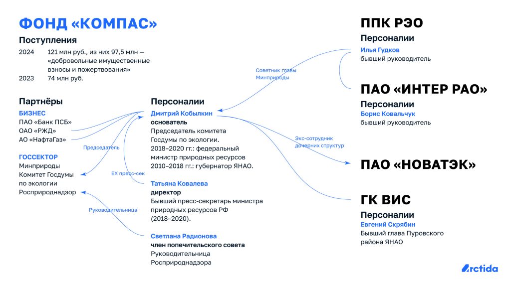 Фонд «Компас» возник летом 2022 года. Руку к этому приложил уже знакомый читателю Дмитрий Кобылкин. В попечительский совет фонда входит руководительница Росприроднадзора Светлана Радионова, а руководит фондом Татьяна Ковалева, работавшая пресс-секретарём Кобылкина, когда он занимал должность министра природных ресурсов.