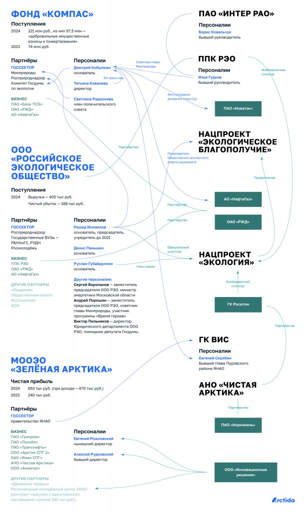 «Зелёная Арктика» — название довольно смелое. Арктика — белая. Зелёной она станет, только когда растает, а это будет катастрофой. Как бы то ни было, эта организация тесно сотрудничает с правительством ЯНАО. Согласно данным сервиса «Контур.Фокус», первоначально её учредили при участии Ямальского отделения Русского географического общества, Уральского лесотехнического университета и госфонда Сотрудничество Ямала. Среди партнёров «Зелёной Арктики» числятся такие крупные бизнес-структуры, как Газпром, «Лукойл», «Транснефть», связанный с Газпромом «Ачимгаз», а также проекты «Новатэка» — «Ямал СПГ» и «Арктик СПГ 2».