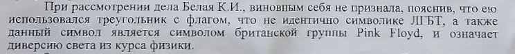 Тем не менее, судья Динара Янузакова посчитала, что это — «линия защиты». Причем в постановлении вместо дисперсии написано «диверсия света». Судья решила, что пиктограмму из ника Белой можно «идентифицировать с символикой запрещенного на территории Российской Федерации общественного движения ЛГБТ».