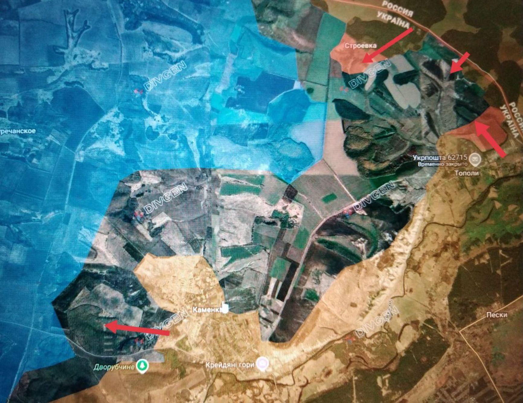 Юрий Котенок рассказывает о переходе ВС РФ госграницы и захвате села Строевка к северо-востоку от плацдарма на правом берегу Оскола. Кроме того, он отмечает продвижение россиян на 1 км к северу от Тополей и на 1,5 км от Каменки к Колодезному.