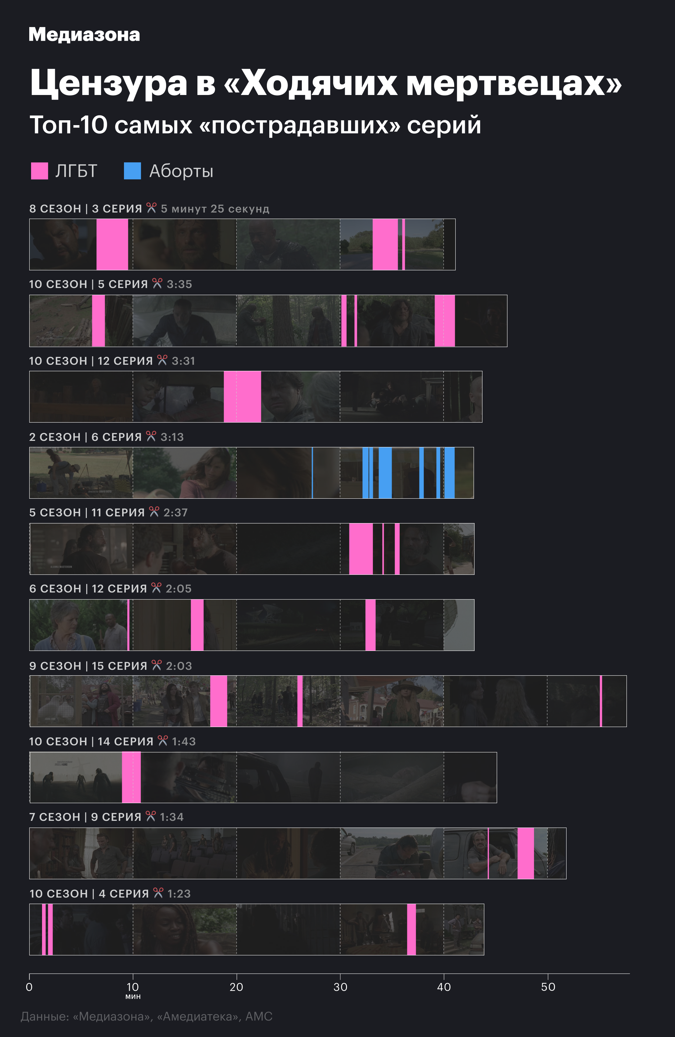 Весной в легальные российские стриминги триумфально вернулся один из главных хитов 2010-х годов — «Ходячие мертвецы». «Медиазона» изучила, как сервис «Амедиатека», который распространяет сериал, обошелся с ним, его многочисленными спин-оффами и смежными документальными проектами. Мы нашли во вселенной «Ходячих мертвецов» больше двух с половиной часов цензуры по самым разным темам: были вырезаны упоминания ЛГБТ, абортов, БДСМ и движения Black Lives Matter. Рассказывая о цензуре во вселенной «Ходячих мертвецов», мы подробно описываем многие сюжетные линии нескольких сериалов. Если вы их еще не смотрели, то вас ждут спойлеры.