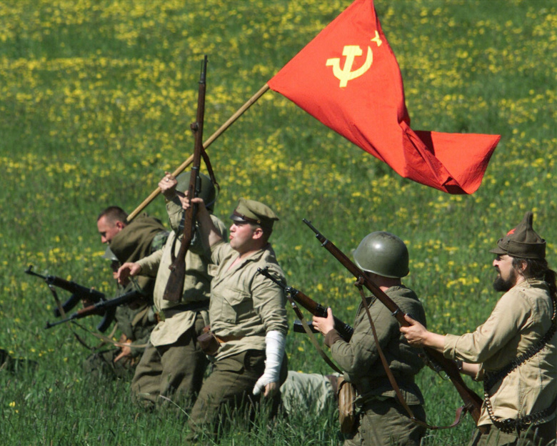 Члены исторического военного клуба, изображающие советских солдат, празднуют победу над немецкими войсками в ходе реконструкции, вероятно, последнего сражения Второй мировой войны в центральночешской деревне Милин 12 мая 2001 года. После окончания войны немецкие войска попытались прорваться через демаркационную линию, чтобы попасть в плен к армии США вместо Советов