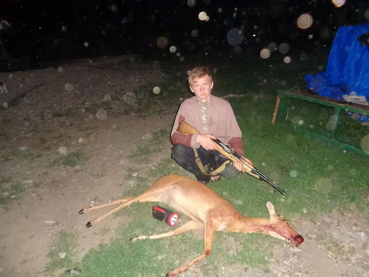 «Разорвало копец, блин. Дырка какая, — комментирует оператор за кадром, показывая освежеванную косулю. — Ногу оторвало же».
