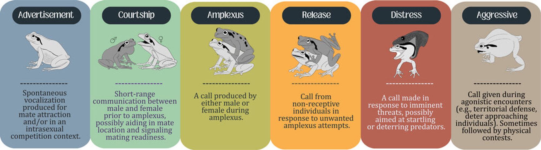 Авторы работы выделили 6 типов вокализации, применимых к обоим полам лягушек