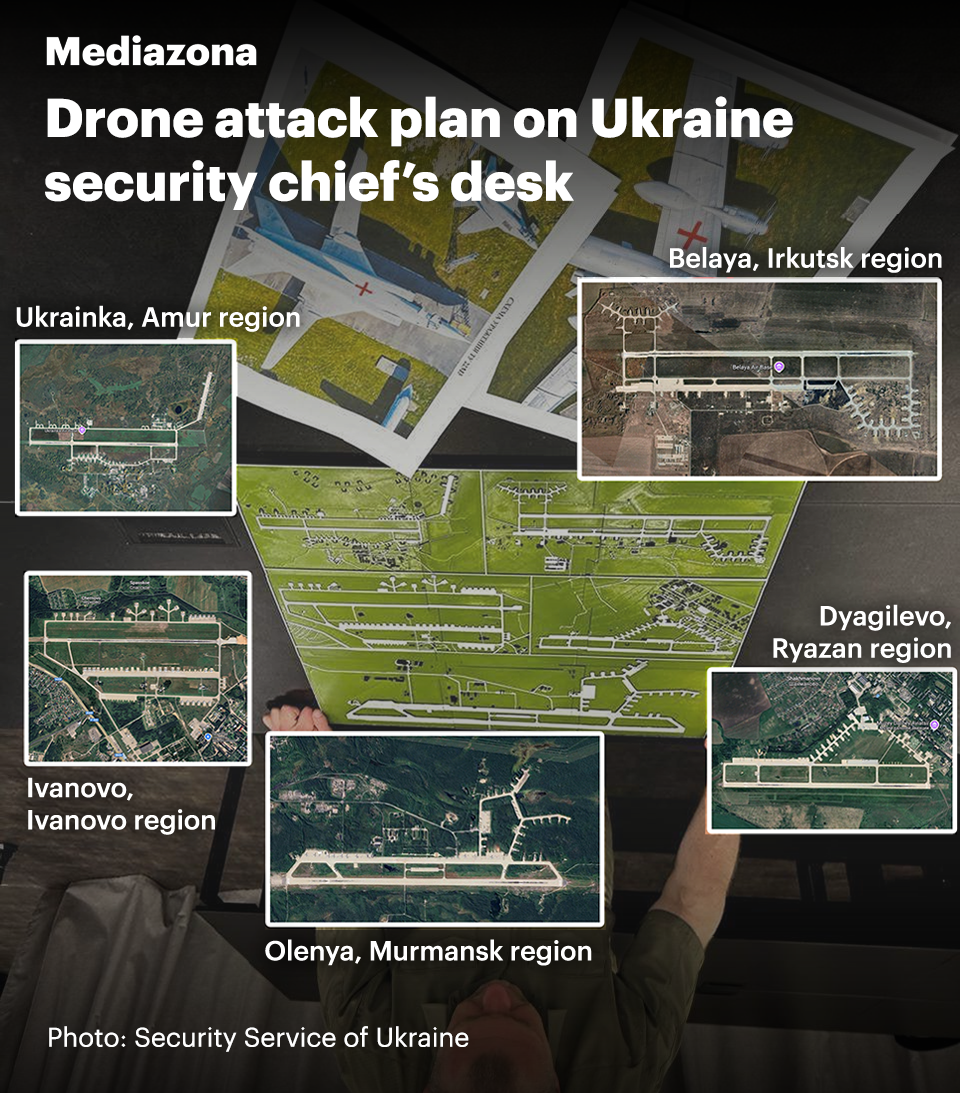 Ukrainian media published a photograph of the head of the agency, Vasyl Malyuk, reviewing a diagram of the operation. The diagram, as analyzed by Mediazona, identifies the airfields targeted in the attack.