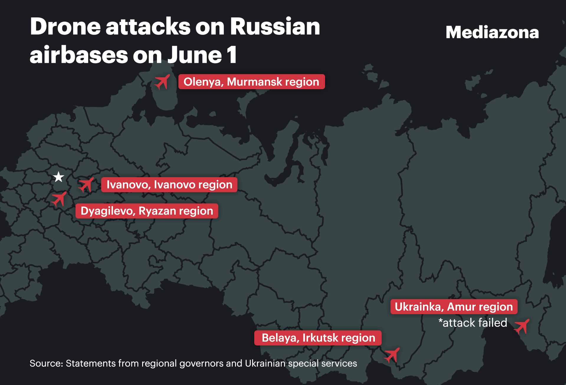 The airbases hit include Dyagilevo in the Ryazan region, Belaya in Irkutsk, Olenya in the Murmansk region, and a base in Ivanovo. An attack on the Ukrainka airbase in the Amur region failed.