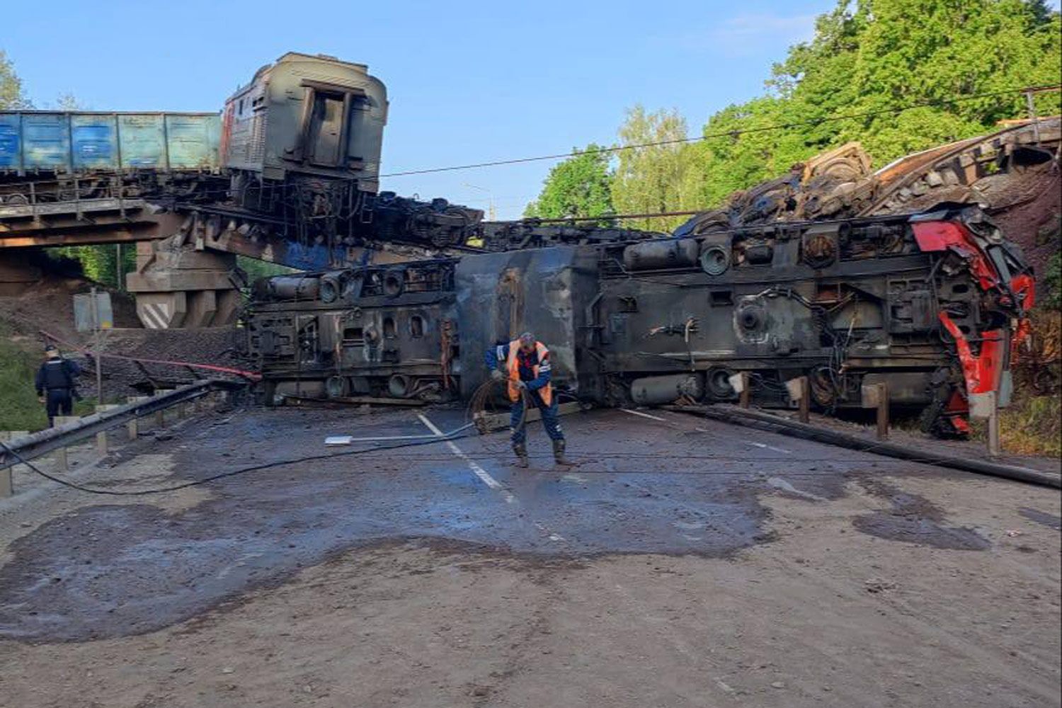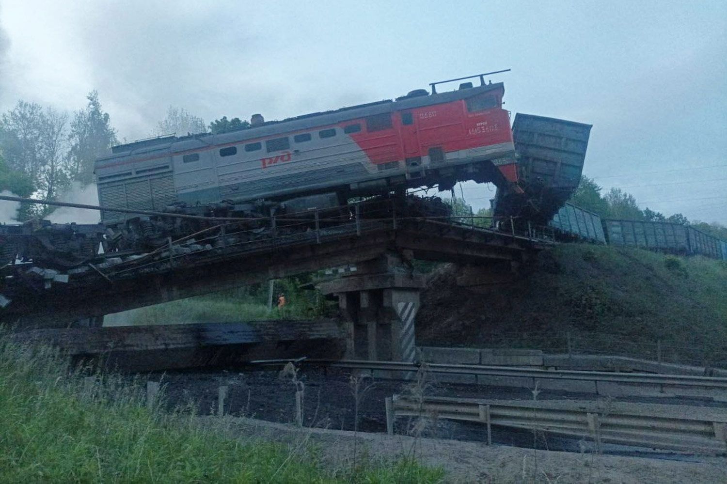 Еще один мост обрушился в ночь на 1 июня в Курской области. ЧП произошло в Железногорском районе на 48-м километре трассы Тросна-Калиновка, сообщил врио губернатора региона Александр Хинштейн. По его словам, мост обрушился, когда по нему шел грузовой локомотив, часть поезда рухнула на автомобильную дорогу под мостом. В результате загорелся тепловоз, пожар оперативно локализовали. Бригаду машинистов доставили в больницу. У одного из них повреждены ноги. Движение транспорта на автодороге под мостом перекрыто. Причины обрушения моста устанавливаются, добавил Хинштейн. Shot и Baza утверждают, что мост в Курской области мог быть подорван так же, как в Брянской. По данным телеграм-каналов, самодельная бомба могла быть заложена в конструкцию моста.