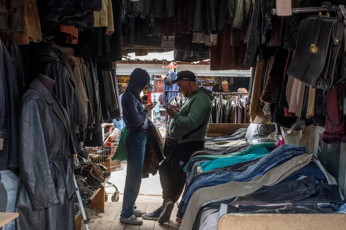 Рынок рядом — туда возят белорусский трикотаж и сомнительную обувь. Некоторые палатки отданы под нишевый гардероб: камуфляж и берцы. Часть торгует исключительно трениками либо поддельной джинсой винтажных фасонов. С 90-х ассортимент почти не изменился, вместе с эпохой ушли только лотки с аудиокассетами, от Михаила Круга до Элтона Джона, обеспечивавшие музыкальный фон ярмарки. Музыкой почему-то всегда торговали не с прилавков, а с капотов машин, застеленных одеялом. Все остальное сохранилось, даже интонации: «Ой, как хорошо вам! У меня муж такие же носит!», «Мы пойдем еще походим, потом вернемся». Калоши, фуфайки, «абибас», грабли и саженцы… На картонках народ меряет куртки и штаны. Невдалеке можно купить домашней колбаски и яиц.