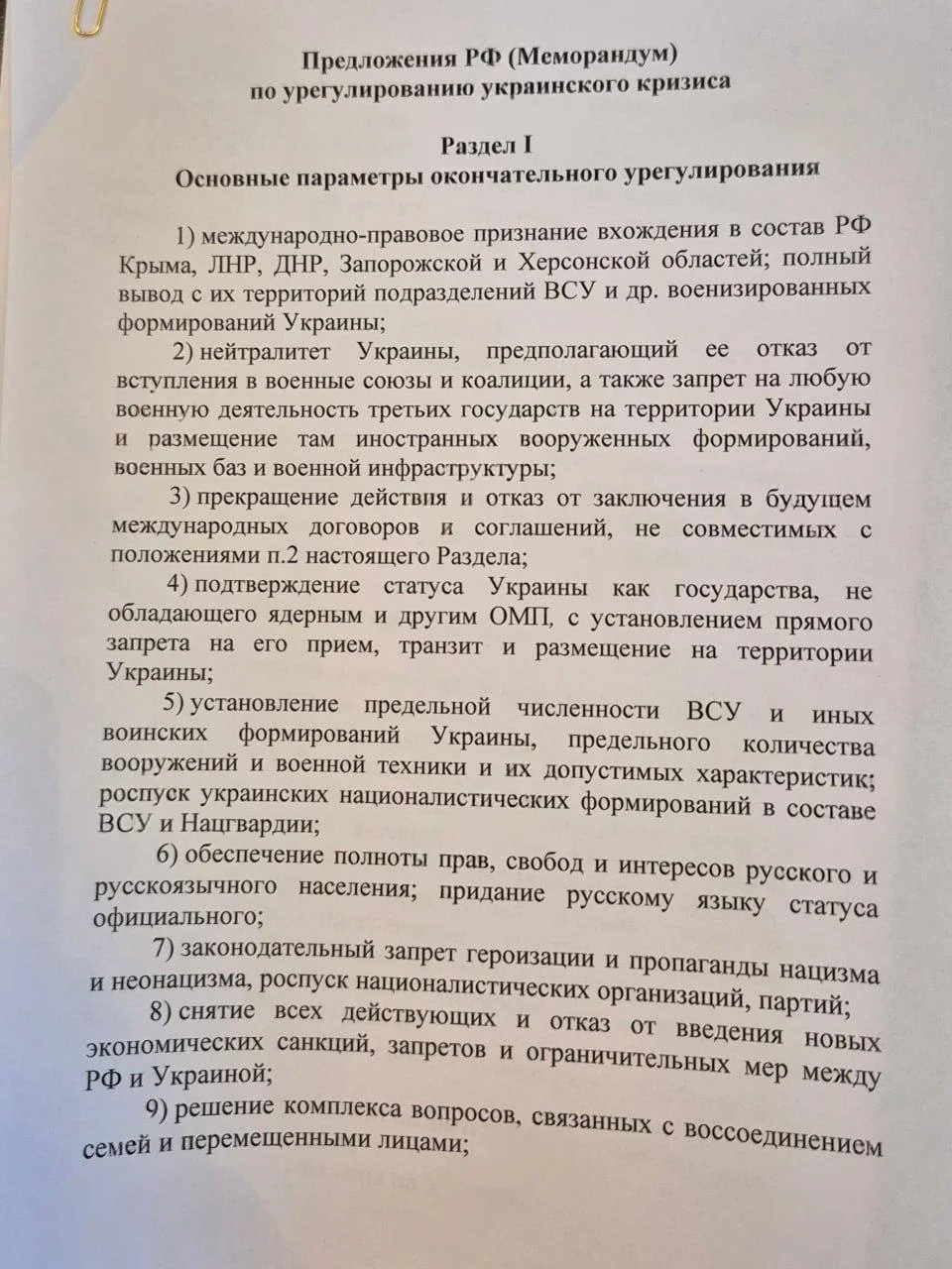 Полный текст украинского меморандума еще вчера вечером опубликовало Reuters: по данным агентства, Киев разработал поэтапный план урегулирования, который предполагает полное прекращение огня сроком не менее чем на 30 дней, обмен всеми военнопленными, возвращение украинских детей, вывезенных Россией, а также личную встречу Владимира Зеленского и Владимира Путина.