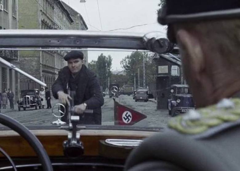 Сцена из фильма «Человек с железным сердцем»: Габчек пытается выстрелить в Гейдриха, но у него заел пистолет-пулемет