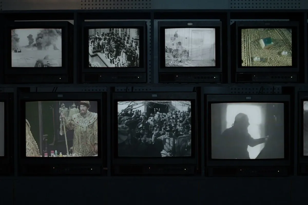 В финале на одиннадцати маленьких экранах — мозаика времени, в котором все быстро течет и ничего не меняется: видеокадры с Лениным, Лебединое озеро, иконы и Гагарин, шапка Мономаха…