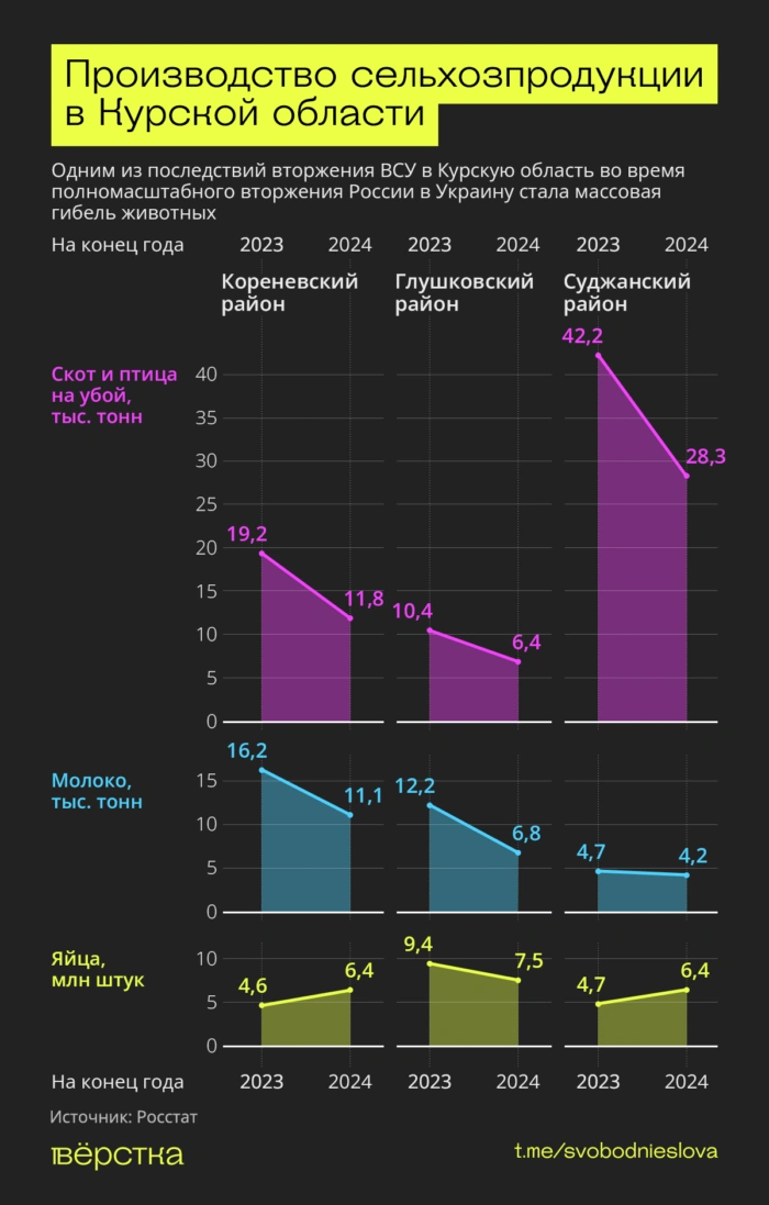 Потери скота повлияли на производство мяса. В Суджанском районе, который был оккупирован, производство скота и птицы на убой по итогам 2024 года сократилось на треть. В Кореневском и Глушковском, где была эвакуация, — на 39 и 35%.