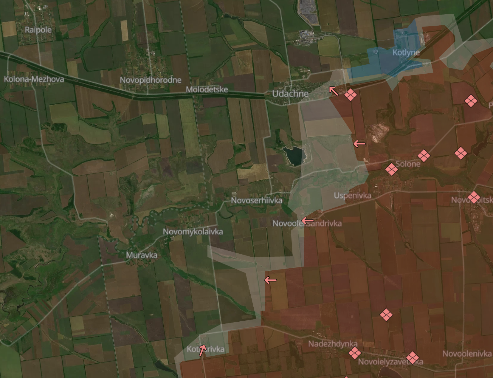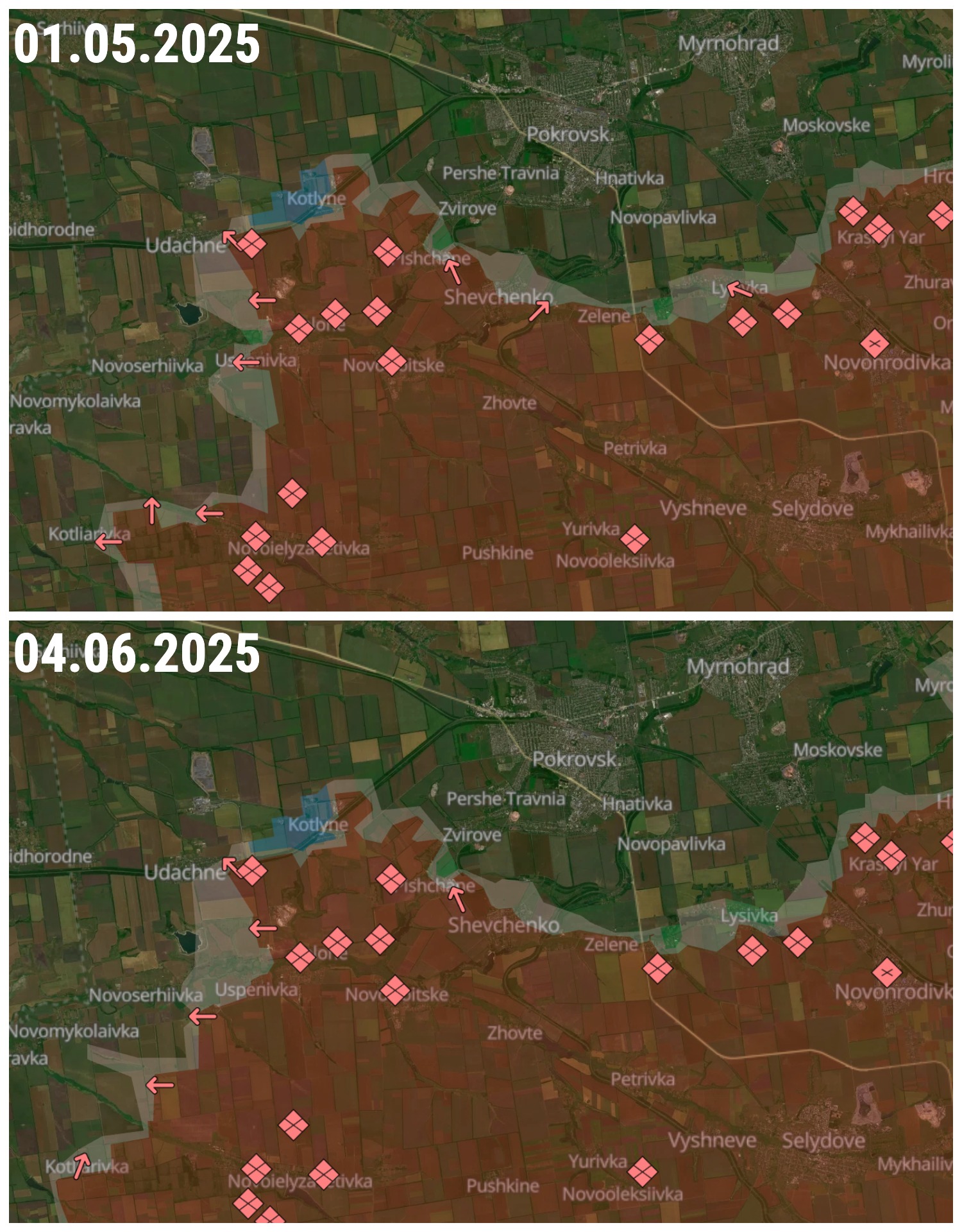 Российские войска около полугода не оставляют попыток отрезать Покровск (город на западе Донецкой области) с юго-запада. ВС РФ атакуют в районе сёл Котлино, Песчаное и Удачное, но продвинуться там им пока не удаётся. Куда лучше для них складывается ситуация южнее: там за последний месяц под контроль ВС РФ перешло сразу несколько населённых пунктов.