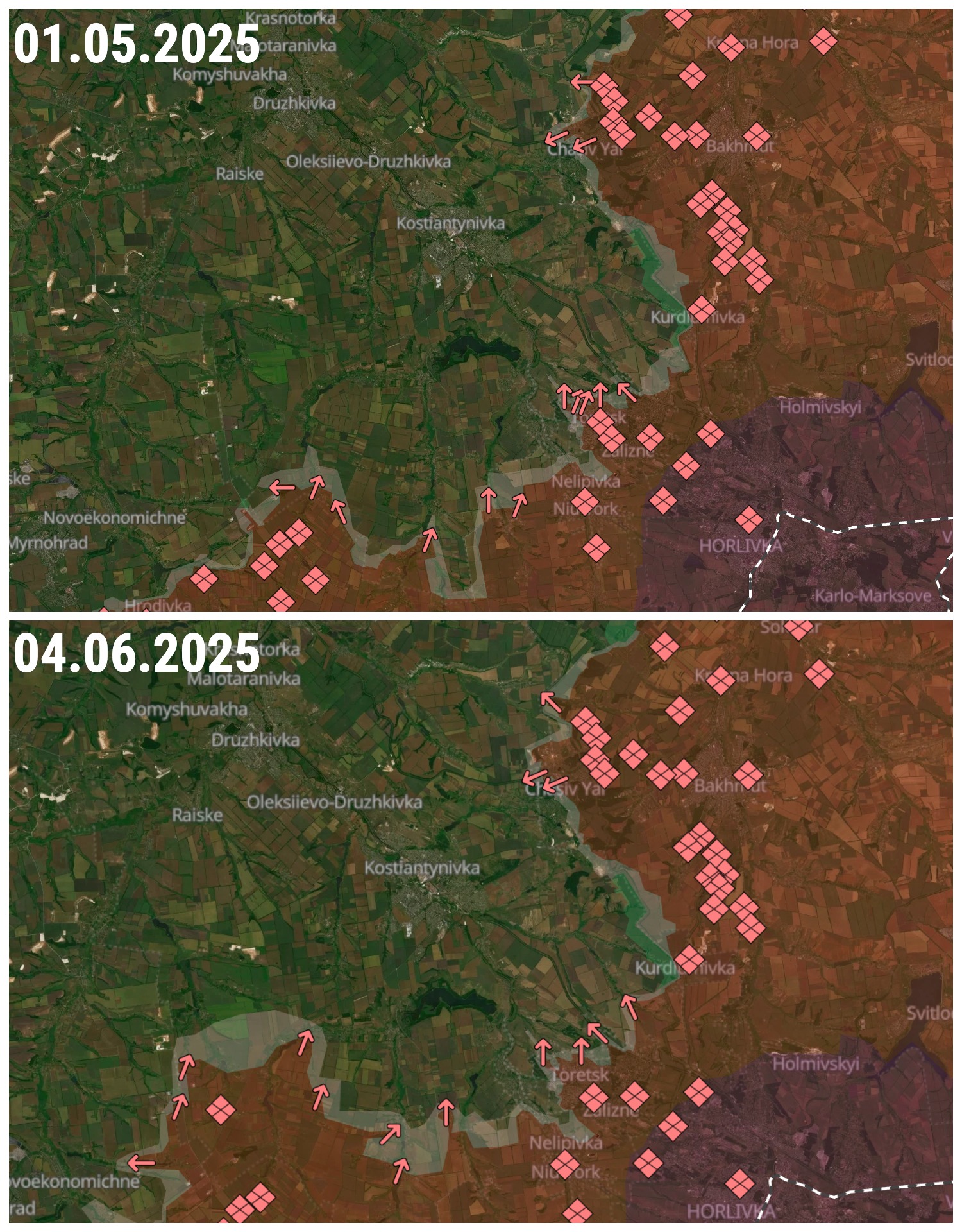 Если Торецк и Часов Яр, где российские войска уже долгое время скованы городскими боями, остаются под частичным контролем ВСУ, что не позволяет ВС РФ подойти к Константиновке с востока, то на юге ситуация для группировки, обороняющей город, в мае значительно ухудшилась: там российская армия продвинулась широким фронтом на несколько километров в направлении города.
