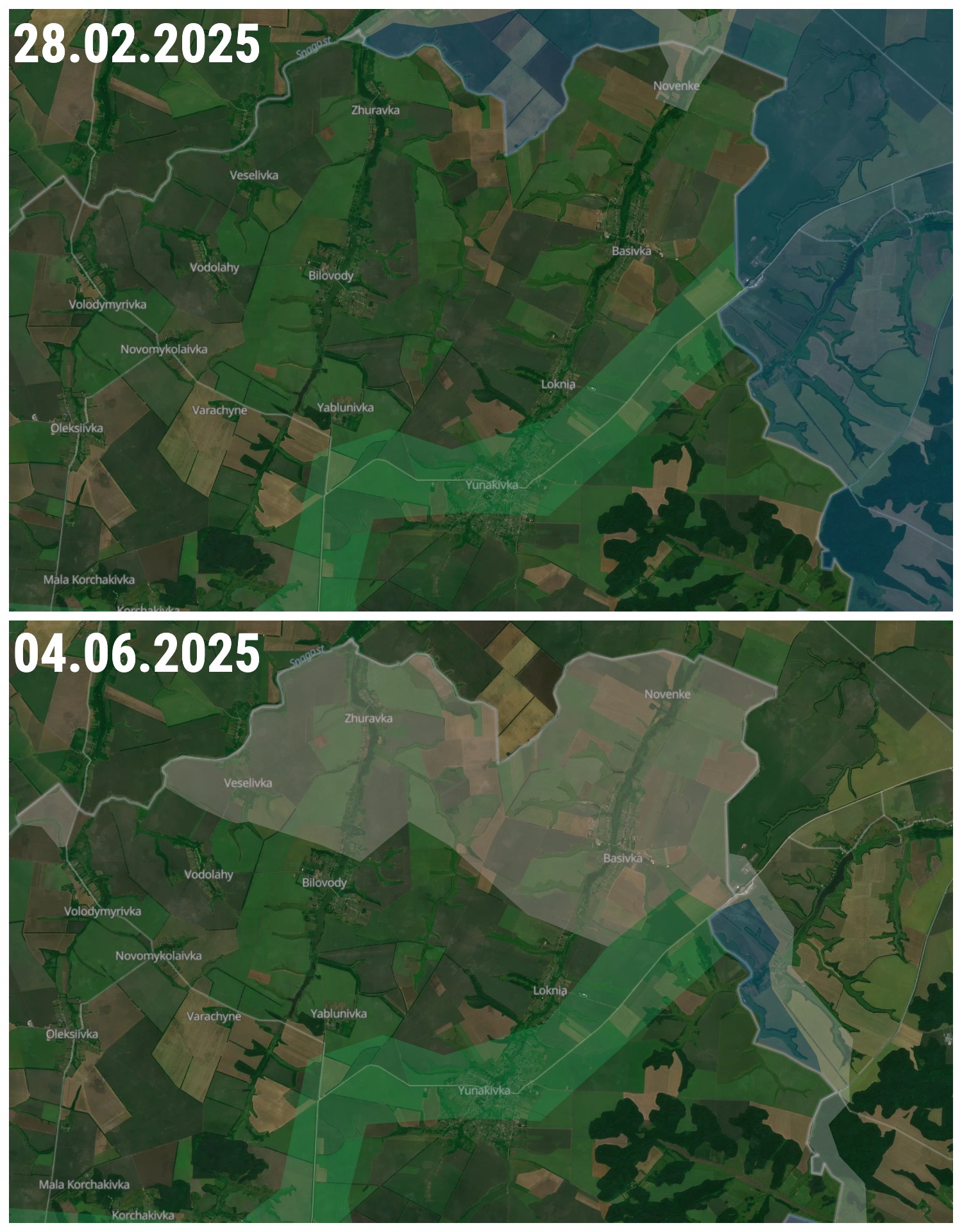 Российские войска также активно продвигаются и в Сумской области: начиная с февраля 2025 года, после вытеснения украинских подразделений из Курской области, российская армия старалась продвинуться дальше и закрепиться уже на территории Украины. Войска РФ пытались прорвать границу в районе сразу нескольких населённых пунктов: сначала в районе Новенького и Журавки, а к концу марта локальные бои начались также в районах Веселовки и Владимировки.