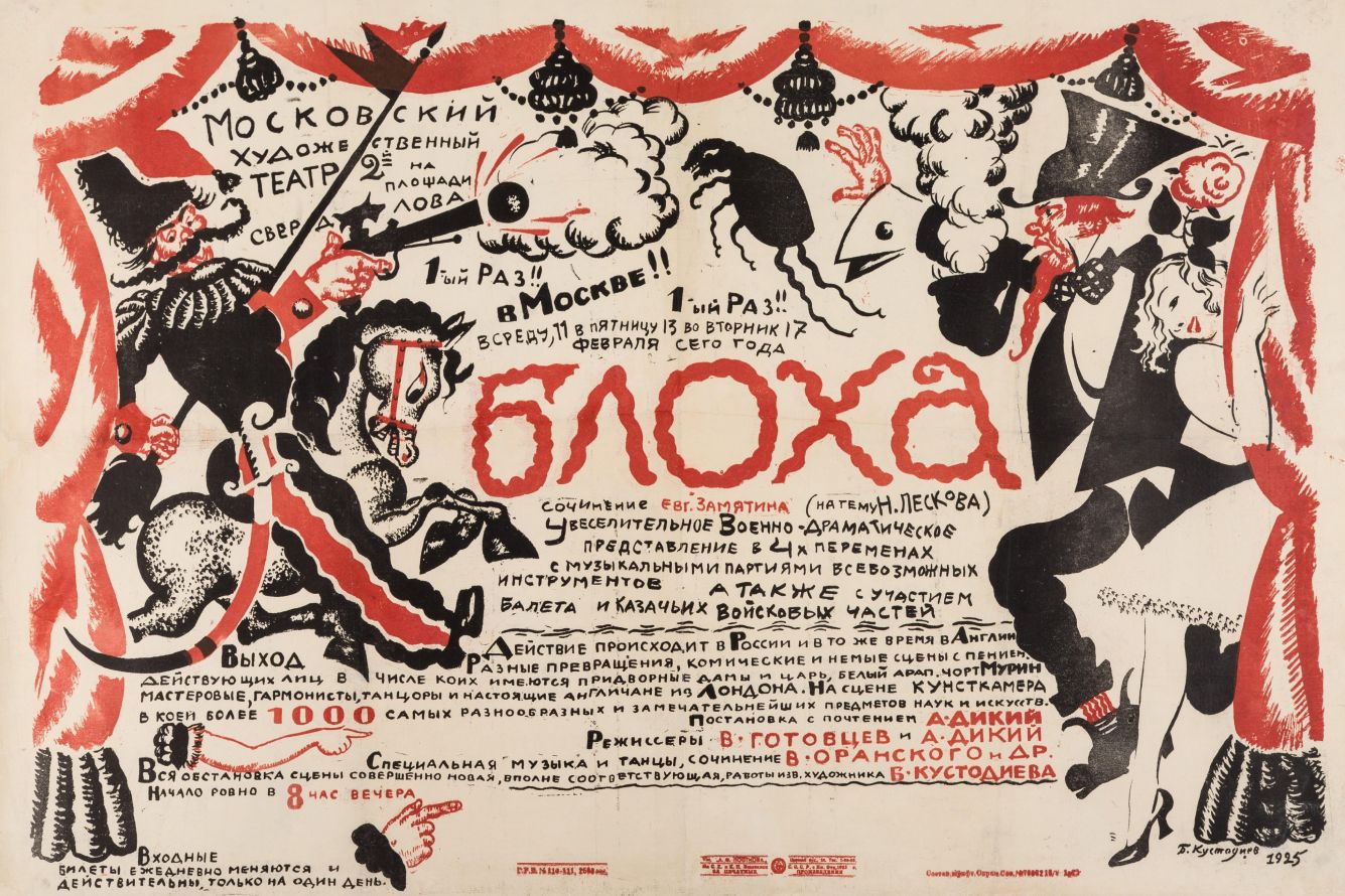 В Инженерном корпусе Третьяковской галереи до конца сентября проходит масштабная ретроспектива Бориса Кустодиева. На выставке впервые практически в полном составе представили эскизы художника к двум спектаклям «Блоха» по повести Николая Лескова (в инсценировке Евгения Замятина, автора антиутопии «Мы») — во МХАТе 2-м и в ленинградском БДТ. Кооператив независимых журналистов «Берег» выпустил текст театрального критика Анастасии Паукер о том, как Борис Кустодиев неожиданно появился в работе над «Блохой», заменив другого художника, и предложил решение столь выразительное, что оно подчинило себе режиссуру и игру актеров. «Медуза» публикует материал с незначительной редактурой.