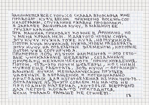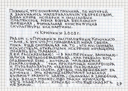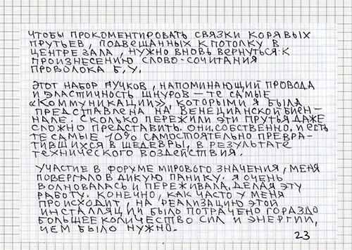 Коммуникации — это то, что спрятано за специальными панелями, стенами, полом и потолком. Художник ищет связи, связи всего со всем, делает невидимое явным. Художественные выставки выявляют процесс взаимодействия, связи человека с человеком. Параллели, пересечения, узлы соединений, точки соприкосновений, начало и продолжение бесконечности — это то, чему я посвящаю свою работу. О видимом и невидимом, о специальном и случайном, о настоящем и кажущемся, о действительном и придуманном, о связи всего со всем.