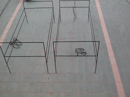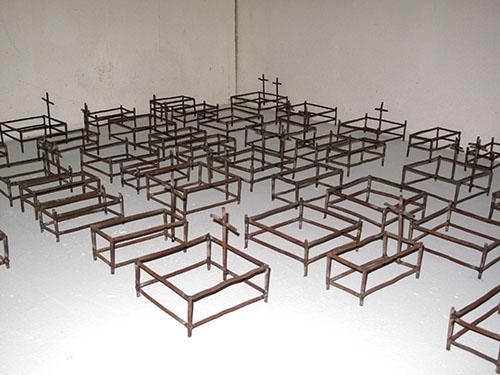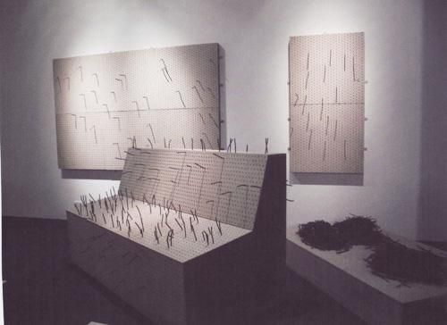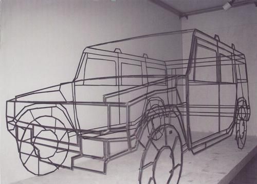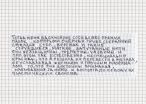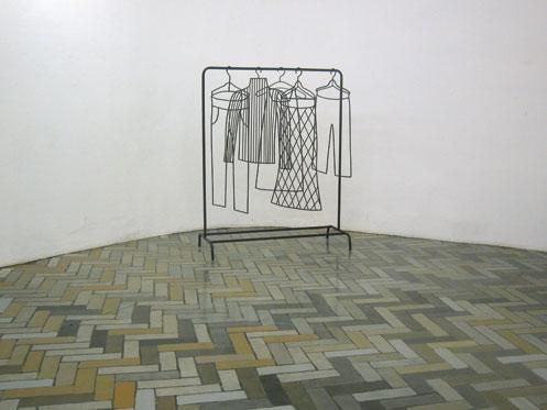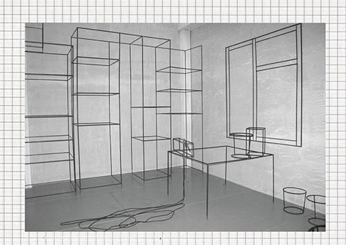 Главный сюжет ее работ — быт: художница создавала интерьеры квартир и офисов, с диванами и столами, утюгами и чайниками, даже одеждой на вешалках. А тонкие металлические трубки, согнутые в знакомые всем очертания, и пустота между ними помогали показать то, что куратор Дмитрий Белкин назвал «пустотелостью, материальной немощностью» вещей, заполняющих каждый наш день.