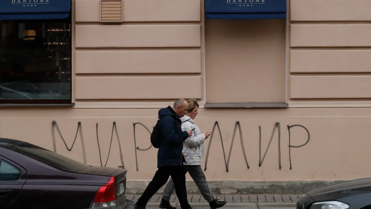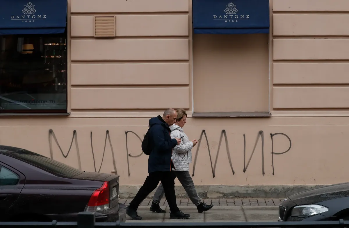 People walk past “Peace to the World” graffiti in St. Petersburg, Russia, 25 March 2022. Photo: EPA-EFE/ANATOLY MALTSEV