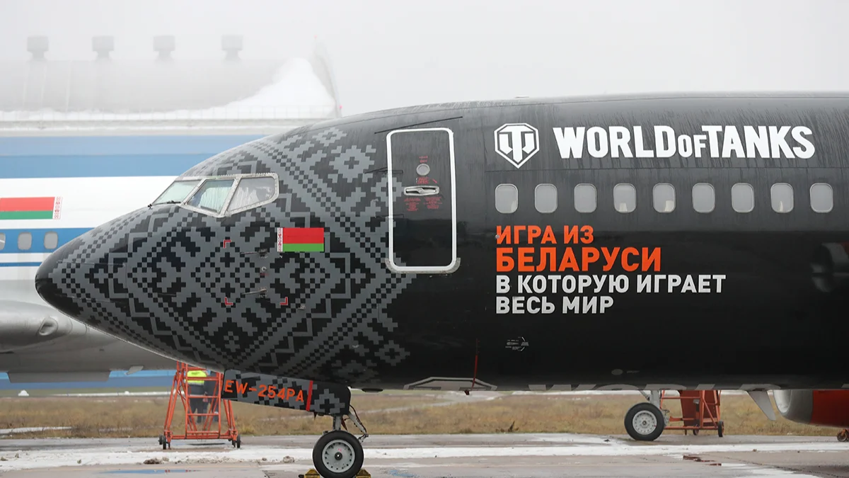 Cамолет авиакомпании «Белавиа» Boeing 737-300 под брендом World of Tanks в Национальном аэропорту Минска, Беларусь, 12 декабря 2018 года. Фото: Tatyana Zenkovich / EPA-EFE