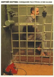Скутин говорит, и его охранники подтверждают, что он читает много религиозной литературы. «Раньше я даже не знал, что такое Библия. А теперь для меня никакие материальные ценности уже ничего не значат». До совершения убийства Скутин дважды попадал в колонии за кражу. В 1992 году он ночью опять залез в чей-то дом, хотел украсть магнитофон и что-нибудь ещё по мелочи. На месте преступления его застал 10-летний мальчик, сын хозяйки дома. Скутин ударил ребёнка и, убегая, поджёг дом. Мальчик погиб, его мать получила тяжёлые ожоги. Сергей Скутин ждёт расстрела уже больше трёх лет. Верховный суд оставил его приговор в силе, так что теперь слово за Комиссией по помилованию. Скутин, судя по всему, подозревает, что отказ из комиссии уже пришёл. «Нам же не говорят, если не помиловали, — поясняет он. — Только перед самым расстрелом». На расстрел могут увести в любую ночь, обычно приходят часа в три.