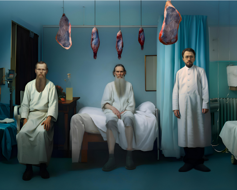 Работа с выставки «Голубое сало». Из переписки Владимира Сорокина с Евгением Никитиным: «Евгений, еще один сюжет: Толстой, Достоевский и Чехов в больничной палате, куски blue lard висят на крюках в виде люстр или одной большой люстры»