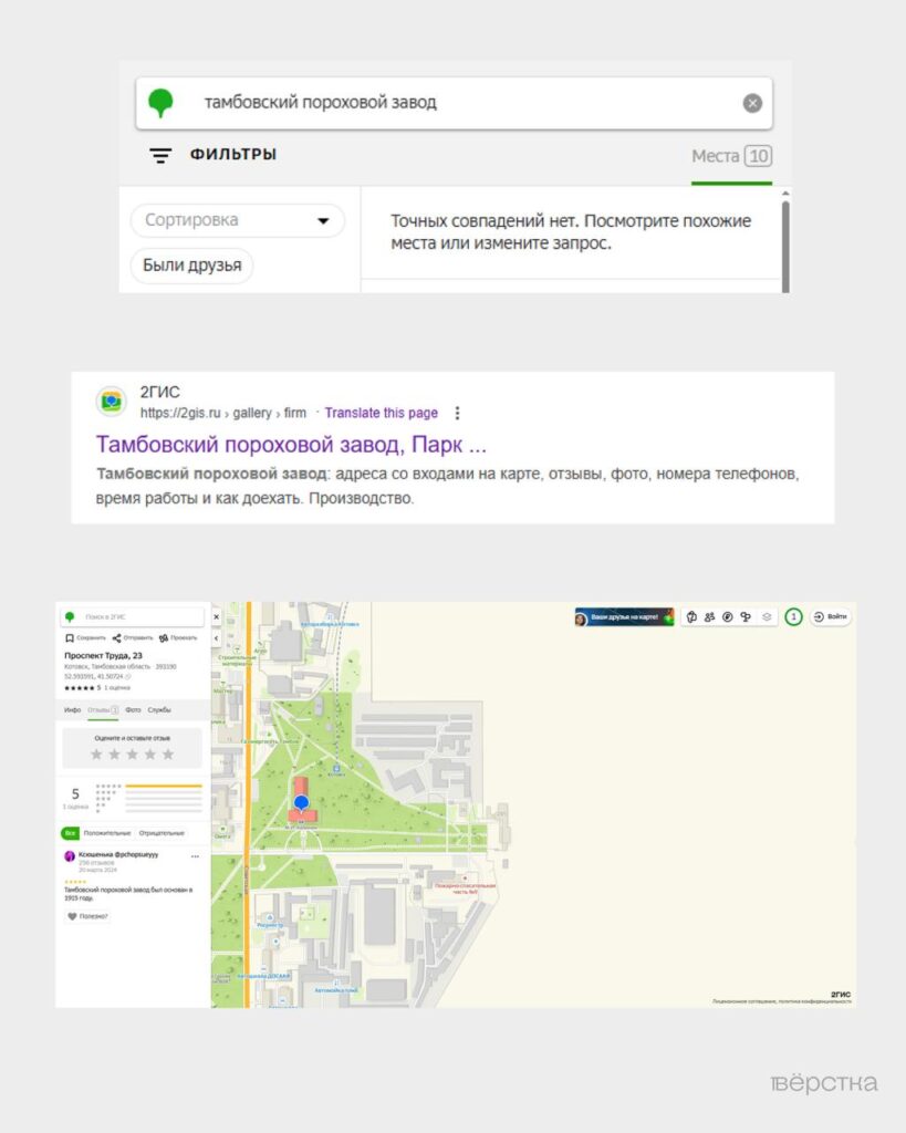 В некоторых случаях с карт были удалены даже адреса предприятий. Например «Электроприбор» находится на Моршанском шоссе, 36 в Тамбове — на «Яндекс. Картах» этот адрес не находится