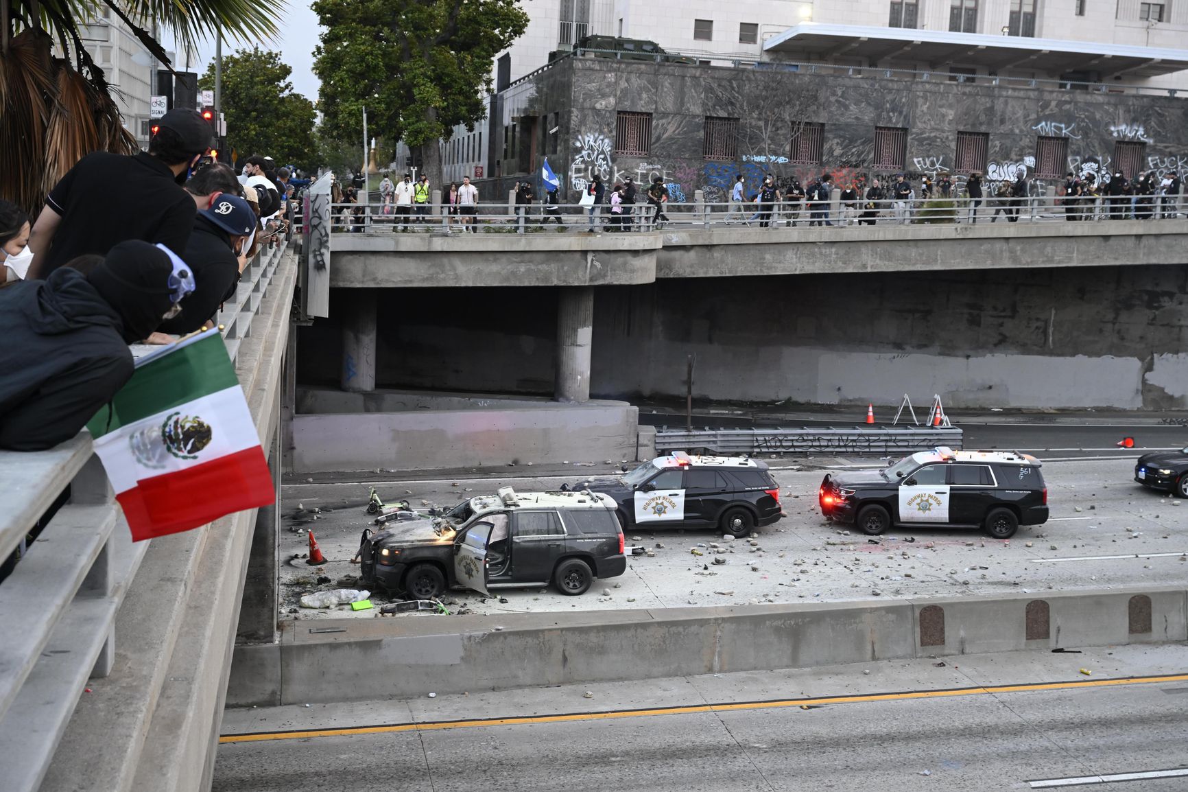 Не менее шести разбитых полицейских машин стоят на шоссе. На эстакаде над ними — группы протестующих с булыжниками. Под эстакадой — обороняющаяся полиция. Каждый раз, когда очередная полицейская машина пытается пробиться к осажденным полицейским, в нее летят камни, ветки деревьев, мусор и петарды.