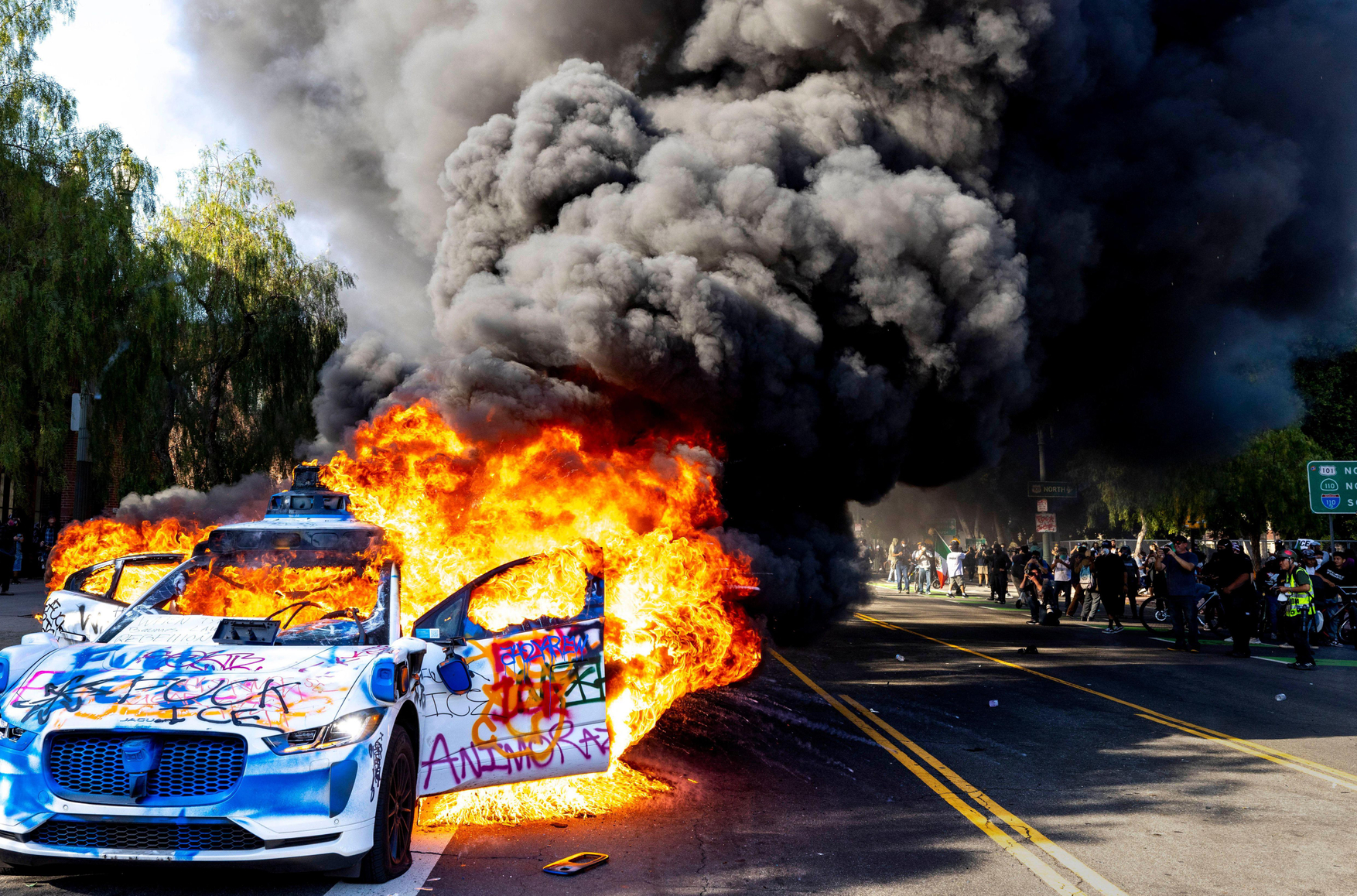 Это картина беспорядков в Лос-Анджелесе, спровоцированных рейдами иммиграционной полиции ICE (Immigration and Customs Enforcement) в иммигрантских кварталах, когда людей хватали на улицах без разбора. За минувшие дни президент Дональд Трамп задействовал для разгона протестов Национальную гвардию и вооруженные силы.