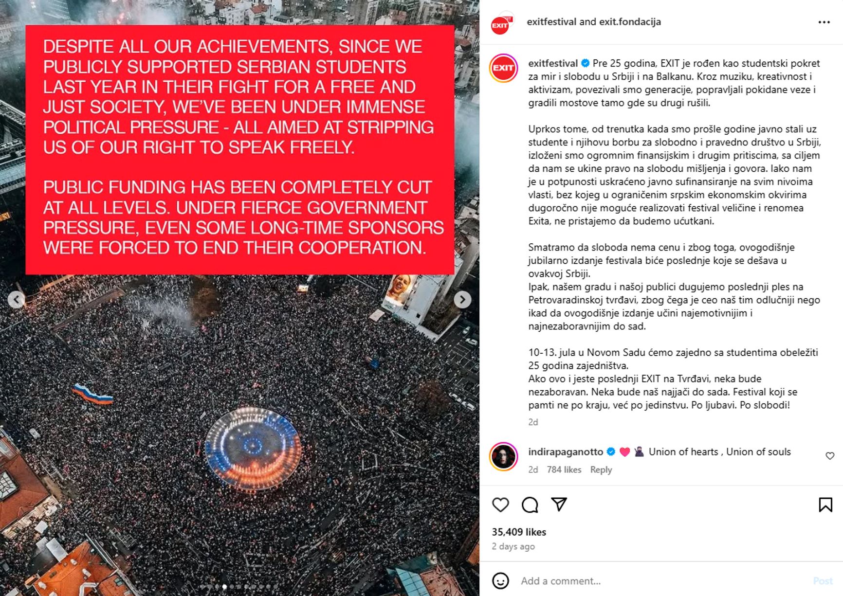 «25 лет назад EXIT зародился как студенческое движение за мир и свободу в Сербии и на Балканах <...> С прошлого года мы публично поддерживали студентов и их борьбу за свободное и справедливое общество в Сербии, мы подвергались огромному финансовому и иному давлению, чтобы отнять наше право на свободу мысли и слова», — говорится в посте на странице фестиваля в Instagram.