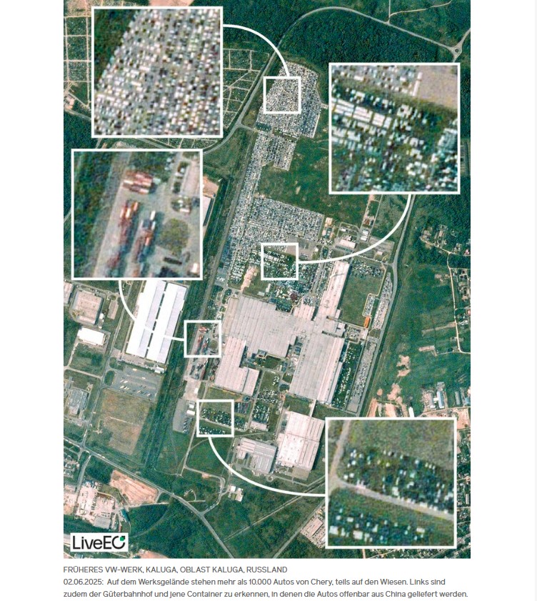 Рядом с бывшим заводом Volkswagen в Калуге, на котором после ухода немецкого производителя из России в 2023 году собирают китайские автомобили Chery, скопилось более 10 тысяч новых машин, и их количество продолжает расти, свидетельствуют спутниковые снимки, которые изучил немецкий деловой еженедельник Wirtschaftswoche.