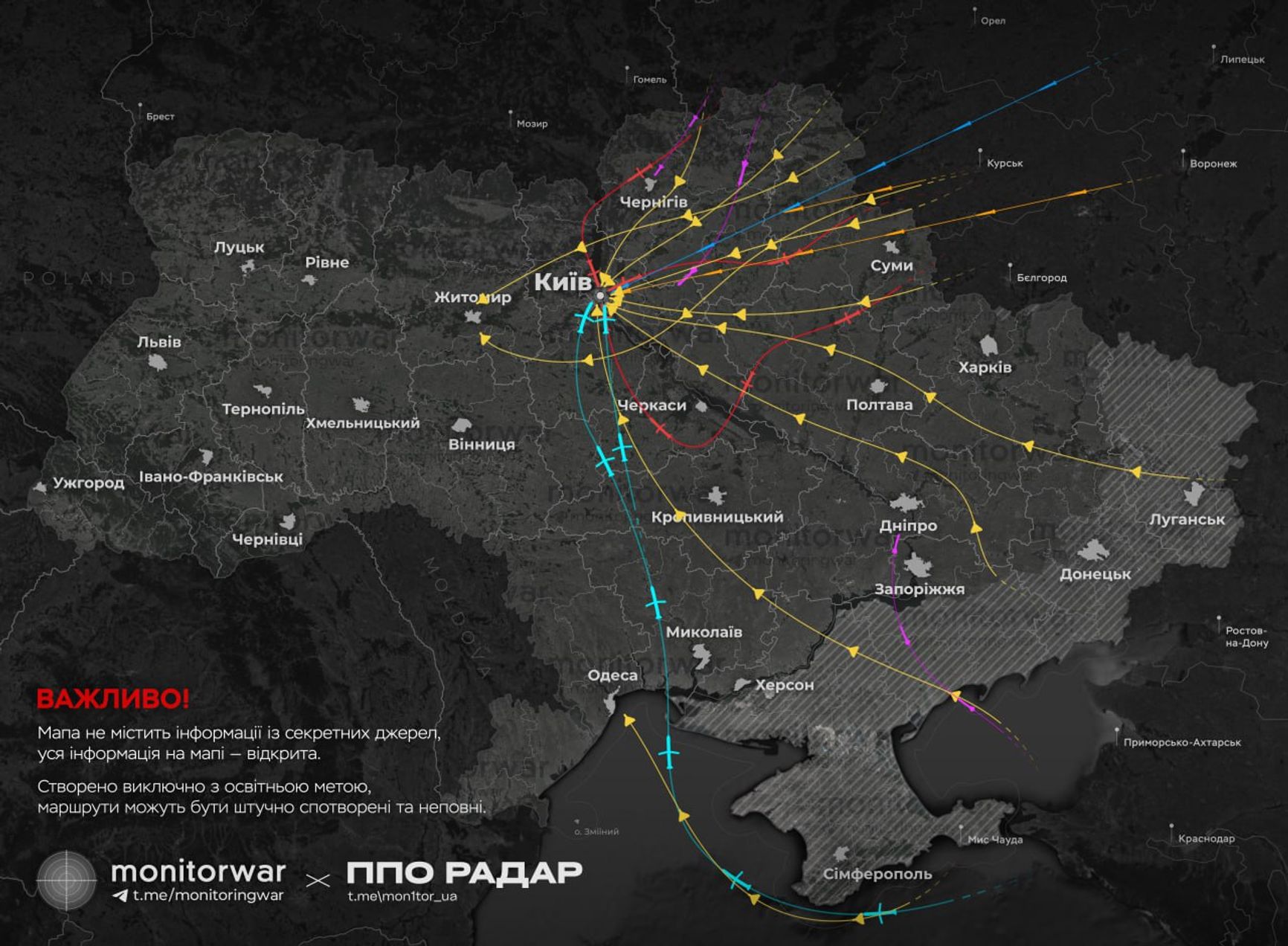 Примерные маршруты движения средств воздушного нападения в ходе налета на Украину в ночь на 17 июня 2025 года