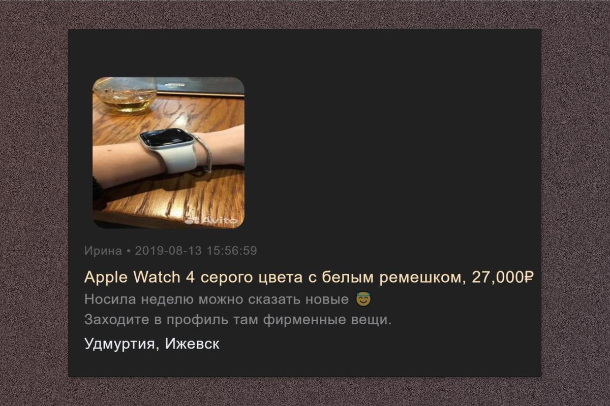 На странице Поповой во «ВКонтакте» есть фотография с этими часами, датированная 24 июля 2019 года. А в августе на «Авито» появилось объявление с аккаунта, привязанного к основному телефону Поповой: «Apple Watch 4 серого цвета с белым ремешком, 27 000 ₽. Носила неделю, можно сказать, новые. Заходите в профиль, там фирменные вещи».