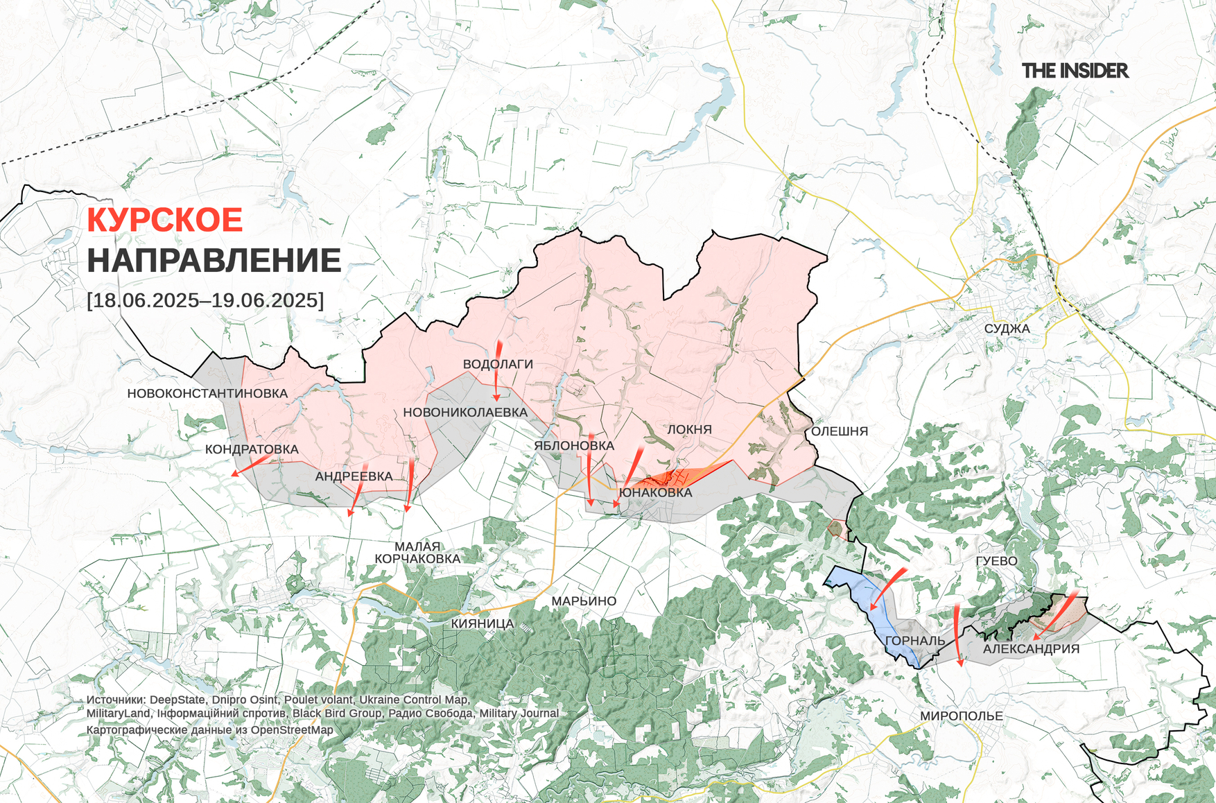 DeepState фиксирует продвижение российских войск около Юнаковки. Пророссийский военблогер Анатолий Радов сообщает, что им удалось «выдавить» части ВСУ на юг за трассу Курск — Сумы.