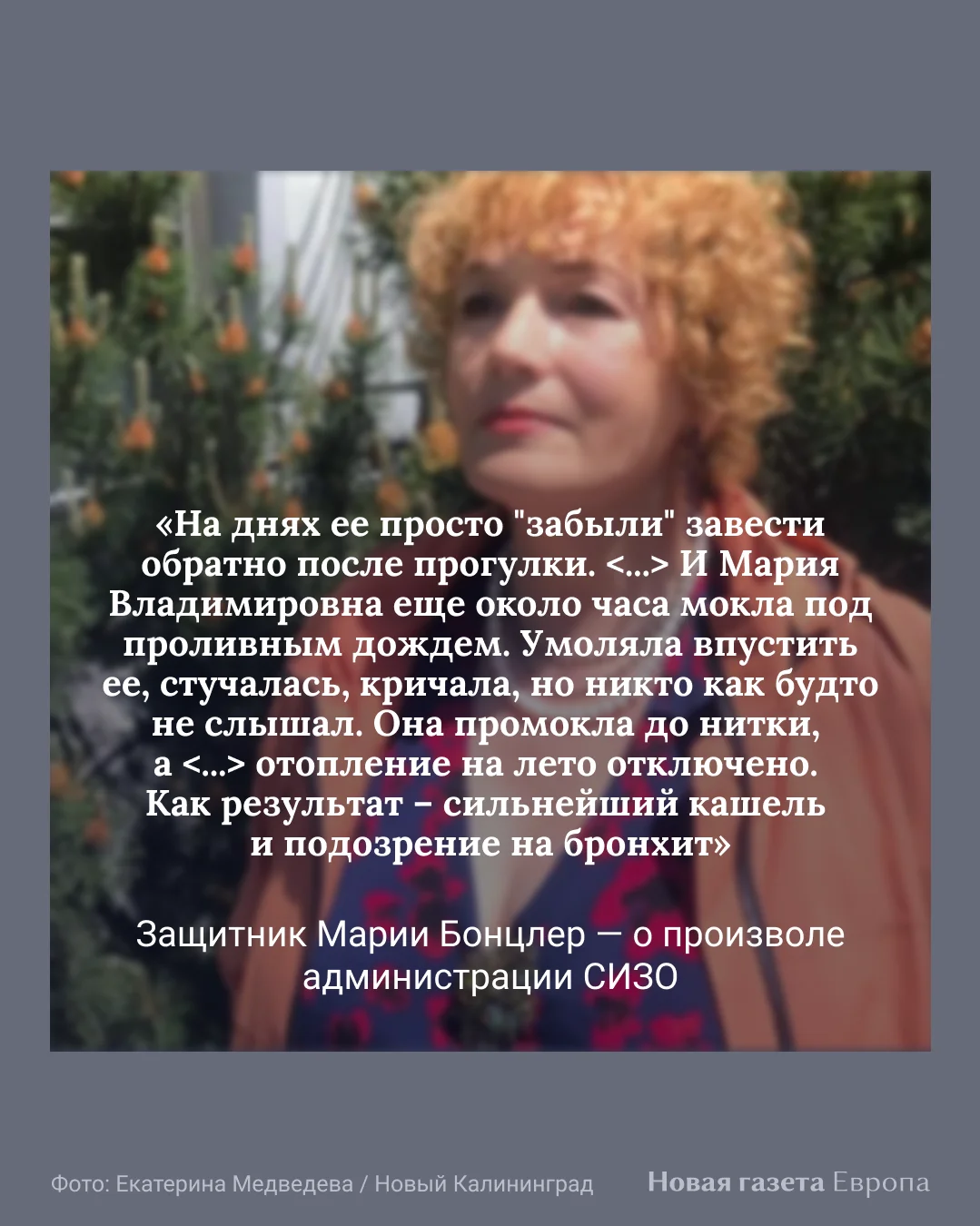 Мария Бонцлер — одна из немногих адвокатов в Калининграде, защищавшая политзаключенных, включая тяжело больного Игоря Барышникова, осужденного за «фейки об армии».