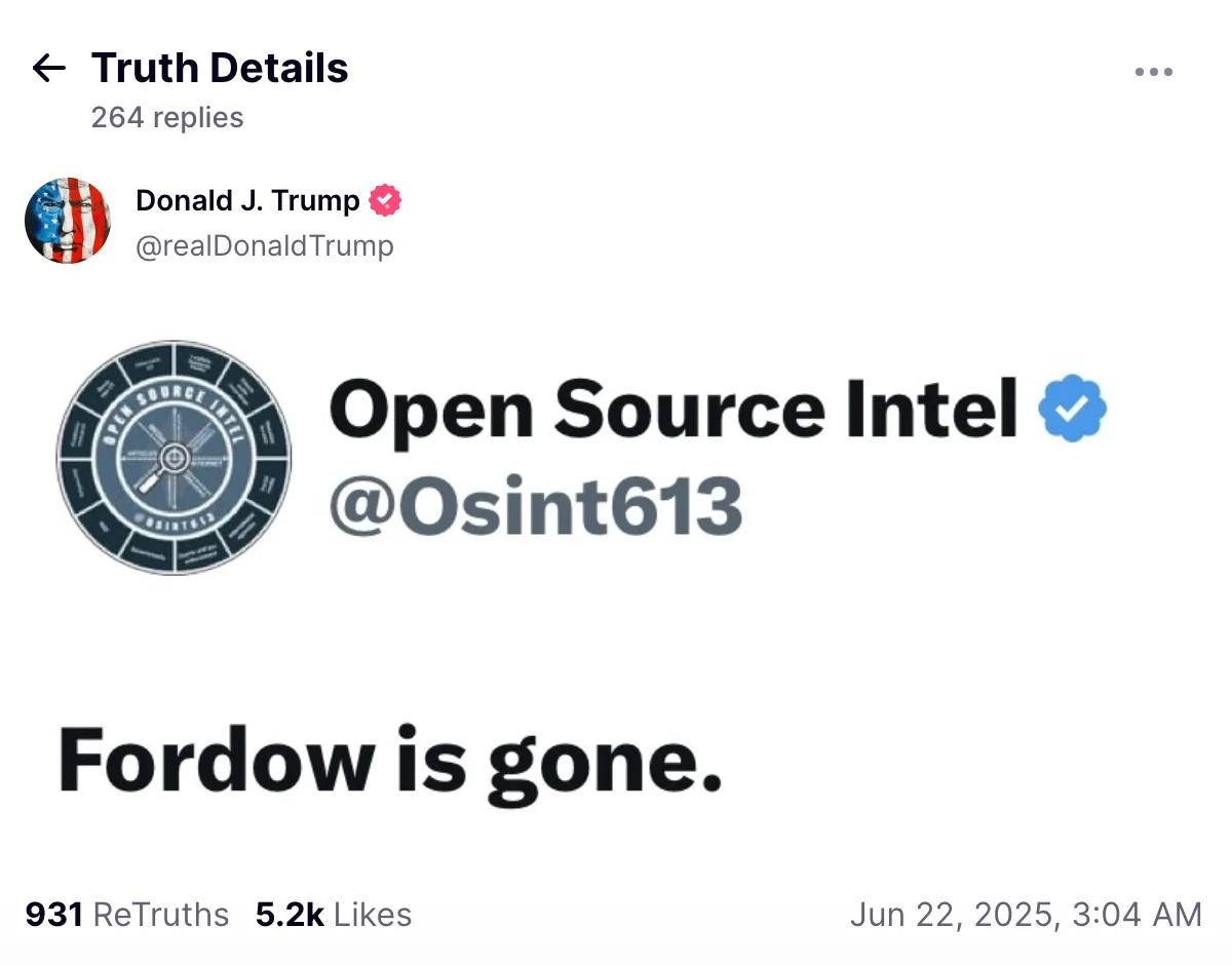 Полный комплект БОМБ был сброшен на главный объект, Фордо. Все самолеты благополучно возвращаются домой. Поздравляем наших великих американских воинов. Ни одна другая армия в мире не могла бы сделать этого. СЕЙЧАС ВРЕМЯ ДЛЯ МИРА! Спасибо за ваше внимание к этой проблеме», — написал президент в своей соцсети.