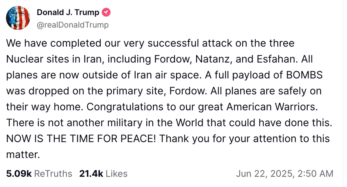 «Мы успешно завершили нашу очень эффективную атаку на три ядерных объекта в Иране, включая Фордо, Натанз и Исфахан. Все самолеты покинули воздушное пространство Ирана.