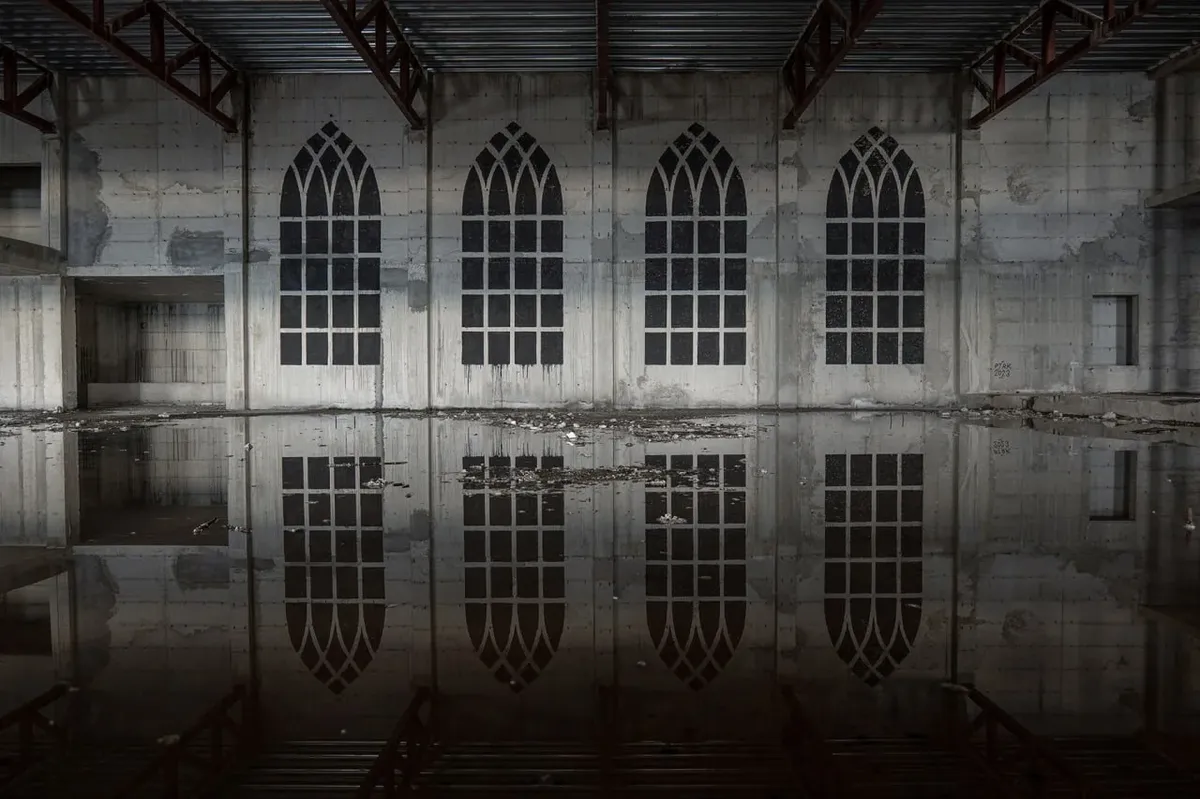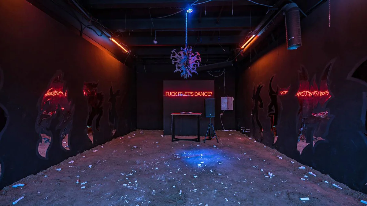 — Взаимосвязаны они скорее в моей голове. Еще до начала войны была работа «Вперед», тоже тотальная инсталляция. Там была пара простых, но крупных объектов и звук. У меня на каждой выставке примерно такая формула. Объекты по отдельности не так важны. Они задумываются частями целого. Так же будет и в Париже. Выставка «Вперед» была попыткой проанализировать, как человек поклоняется разным, скажем так, богам: сначала многобожие, потом единый бог, а потом технологии. Но, так или иначе, человек всё время кому-то поклоняется. На выставке «Макабр» было пространство на первом этаже ТЦ, с черными стенами и полом, засыпанным землей. Зеркала в виде языков пламени, красный свет, тяжелая рок-музыка, слоган Fuck It, Let's Dance, отсылающий к перформансу «Похуй, пляшем», а земля усыпана гипсовыми костями. Подразумевается вопрос: будем мы продолжать танцы уже на костях или останавливаемся и выходим из этой ситуации? Это было в мае 2022-го. Тогда в Москве еще можно было делать такое без привлечения внимания органов.