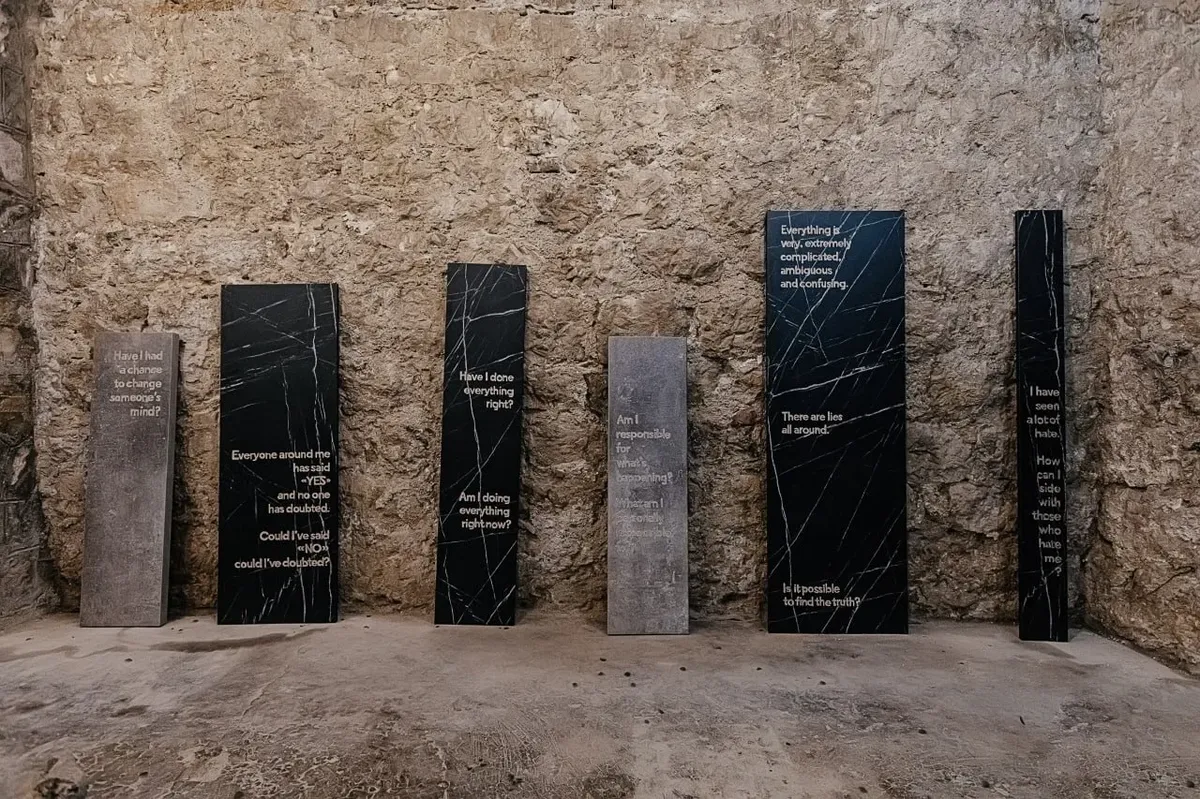 Год спустя, уже после моего отъезда, в Черногории появился проект Present Not Perfect. Там были панели, сделанные под камни, похожие на могильные. На них были вырезаны слова. Как будто они стоят и обсуждают, кто в чем виноват и что им дальше делать. Это логическое продолжение идеи о том, что рядом происходит страшное событие, а нам остается только быть его свидетелями.