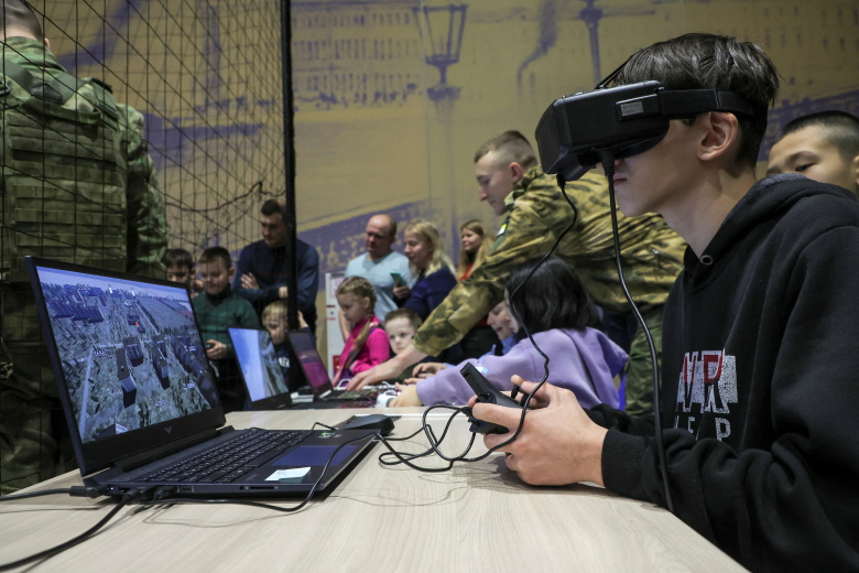 Дети тестируют симуляторы FPV-дронов на патриотическом фестивале «Русские меняют мир» в День защитника Отечества