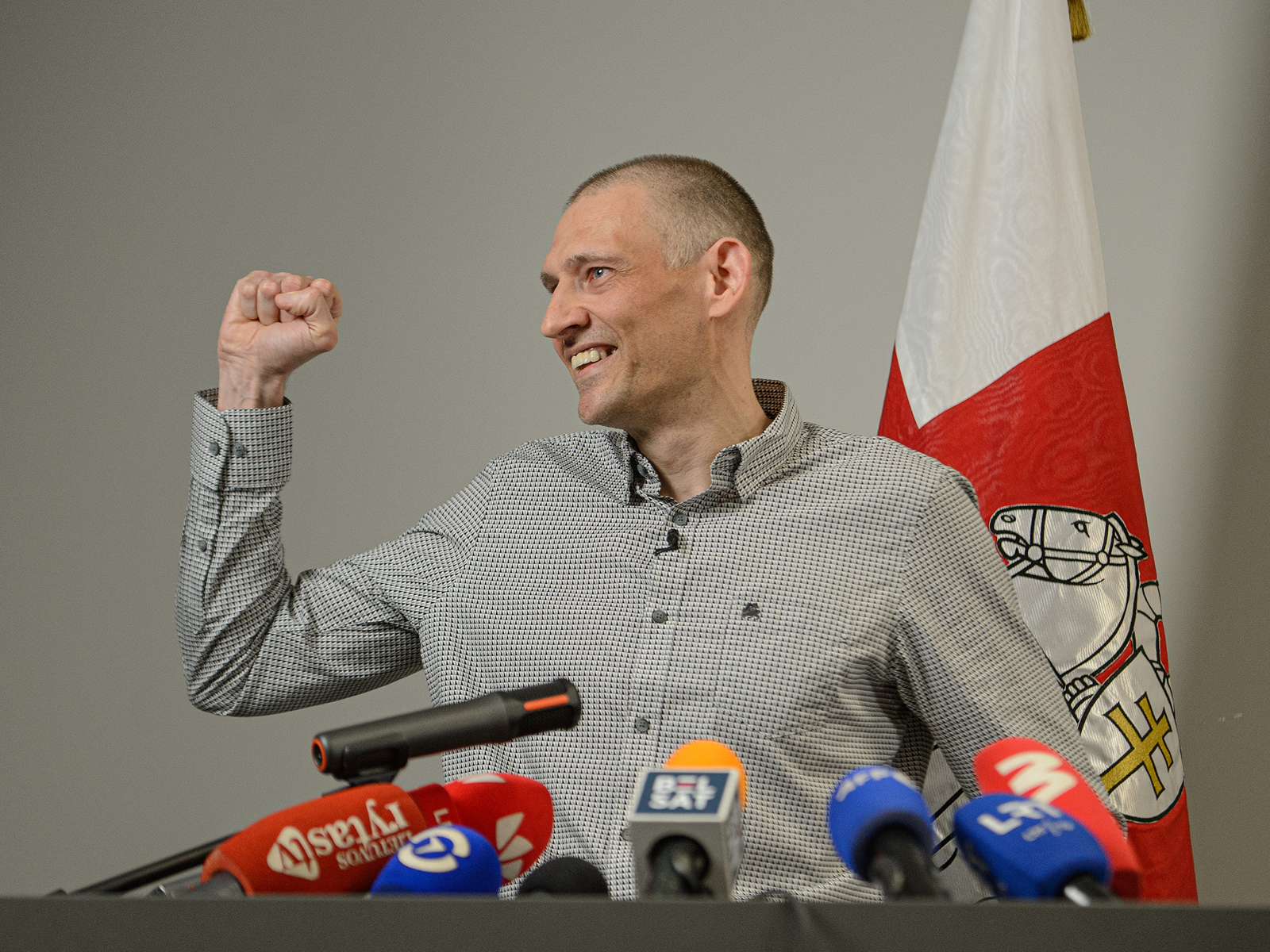 Фото: Сер­гей Тиха­нов­ский про­во­дит пресс-кон­фе­рен­цию после сво­е­го осво­бож­де­ния. Виль­нюс, Лит­ва, 22 июня 2025 года. Yauhen Yerchak / Anadolu
